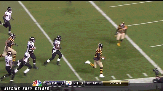 How that fat fuck could get more than four yards without calling a timeout so he could eat a sandwich is beyond me, and it’s even more fucking inept that the Baltimore defense let him slide on a trail of gravy into the fucking endzone. I mean, look. He looks like an overweight drunk bumblebee in that fucking abortion of a throwback jersey. How the fuck do you miss this fucking guy?